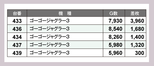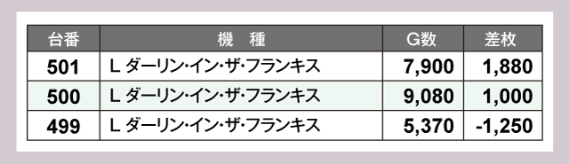 そのほかにも数多くの機種でハイスコアを記録。終日高稼働を記録した『L 東京喰種』では、+8,000オーバーを筆頭に4台がプラス差枚を達成。『スマスロモンキーターンV』や『ゴーゴージャグラー3』始め多くのシマでも好調台が見られ、店内随所で活気が感じられた。