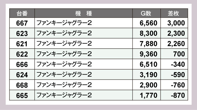 『ジャグラー』シリーズの中から今回は『ファンキージャグラー2』をピックアップ。全台が高稼働で、2,000枚・3,000枚超えが複数あらわれ、店内の熱気を牽引していた。人気の『L 東京喰種』も7台すべてがたくさんのG数を回されていて、プレイヤーたちを満足させていた。導入したての『L ダーリン・イン・ザ・フランキス』からは+9,410枚が飛びだし、そのポテンシャルを痛烈にアピールしている。