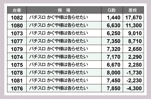1,000円/46枚パチスロコーナーでの注目が『パチスロ かぐや様は告らせたい』10台。1082&1080番台がダブルで5桁プラスのビッグヒットを計上し、その下にも+9,000枚超・+8,700枚超が1台ずつ追随した。