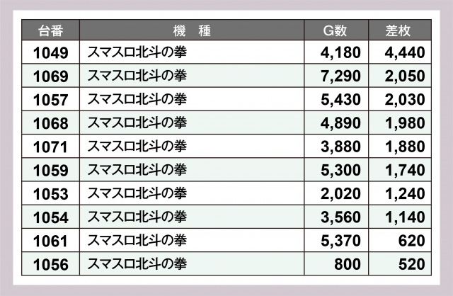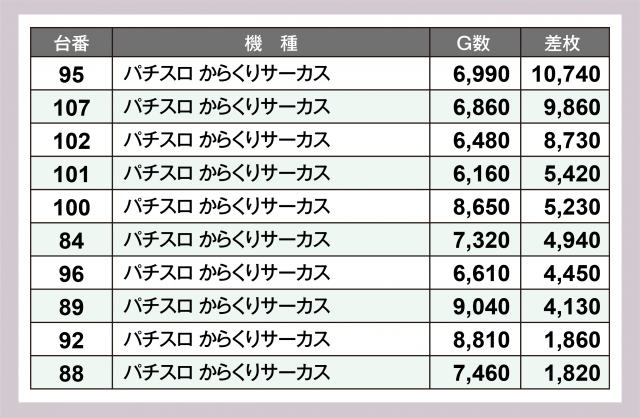 大量設置機種も見逃せない。『パチスロ からくりサーカス』では95番台の+10,700枚超を筆頭に+5,000枚オーバーが連発。『スマスロ北斗の拳』も安定の伸びが窺えた。