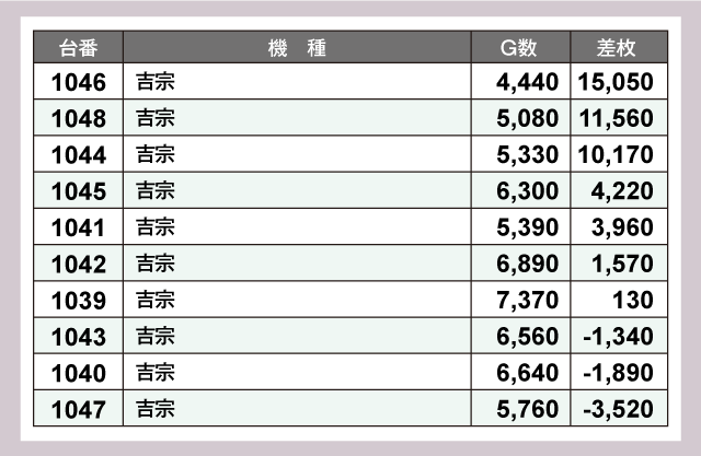 この日、パチスロコーナーで最も目立っていたのが『吉宗』で万枚超が3台も発生。なかでも、1046番台が圧巻の+15,050枚を叩き出しプレイヤーの注目を集めていた。また、その他の台からも多数の好調台が確認されており、最終的に全10台中7台がプラス差枚で実戦を終えている。