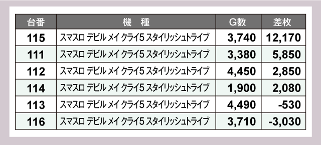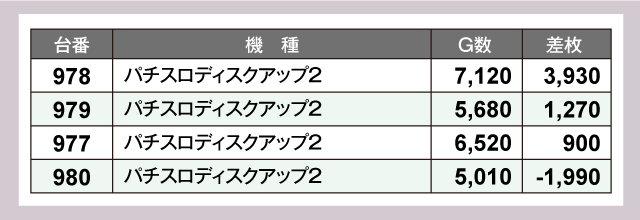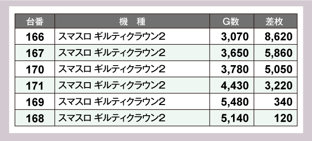 続いて、その他の機種を見てみると『スマスロ デビル メイ クライ5 スタイリッシュトライブ』からも万枚超の+12,170枚、『パチスロディスクアップ2』から+3,930枚を確認。さらに、『スマスロ ギルティクラウン2』は166番台の+8,620枚を筆頭に全ての台がプラス差枚となる見事な結果を残しファンを喜ばせていた。