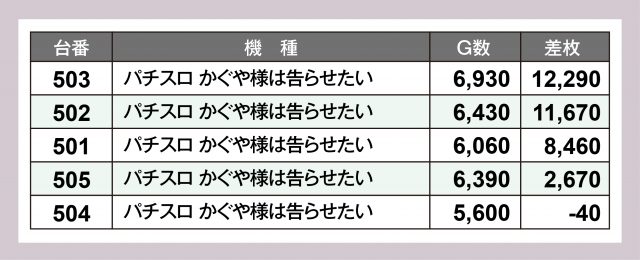 20円パチスロで見逃せないのが『パチスロ かぐや様は告らせたい』。2台が5桁のプラスを収めた上に+8,500枚弱・+2,700枚弱が1台ずつと、この日一番の盛り上がりに達していた。