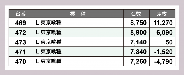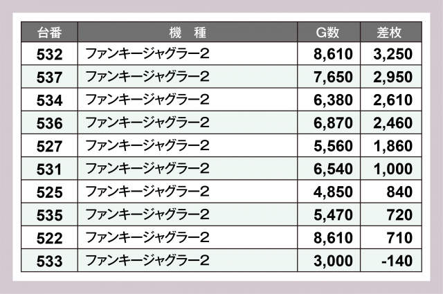 その他に『L 東京喰種』でも万枚オーバー、『L アズールレーン THE ANIMATION』では+8,200枚弱、『いざ!番長』では+6,100枚弱・+4,600枚超が1台ずつと、好成績が連発。さらに『ファンキージャグラー2』ではプラス台の多さが目立っていた。