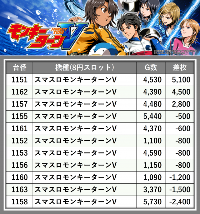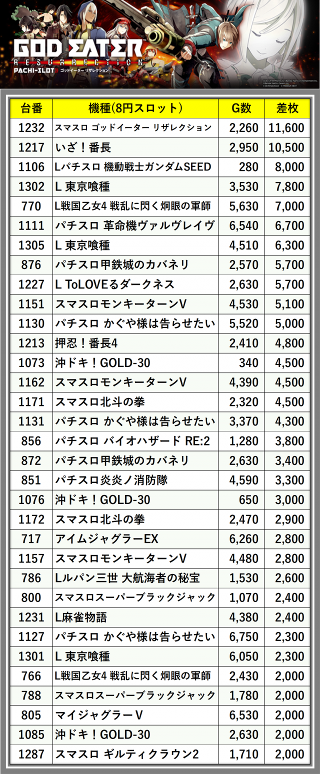 ※差枚数順に掲載しています