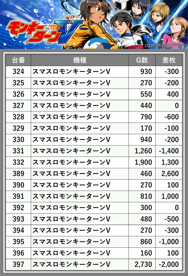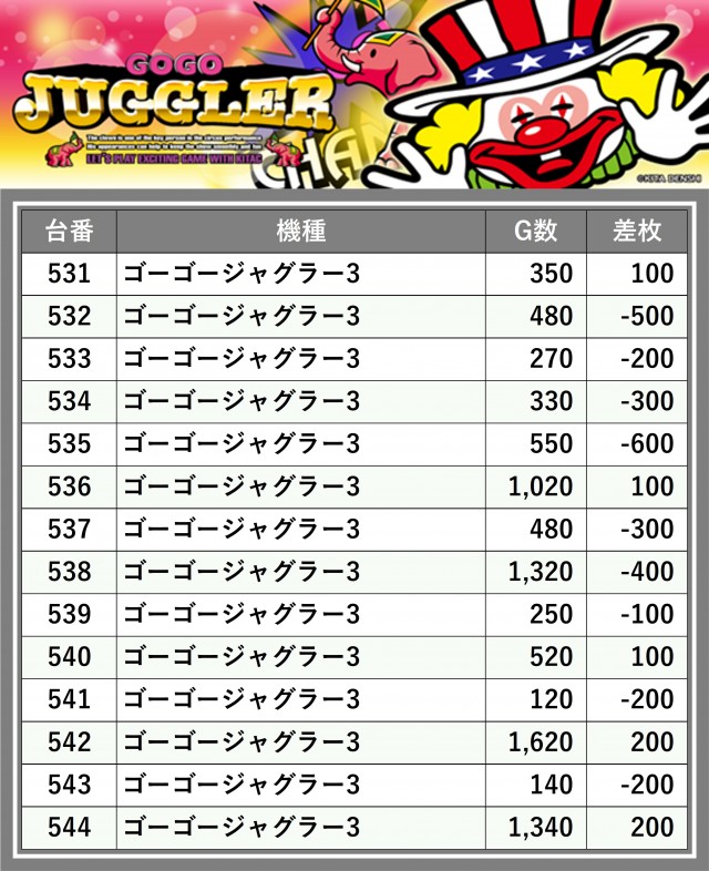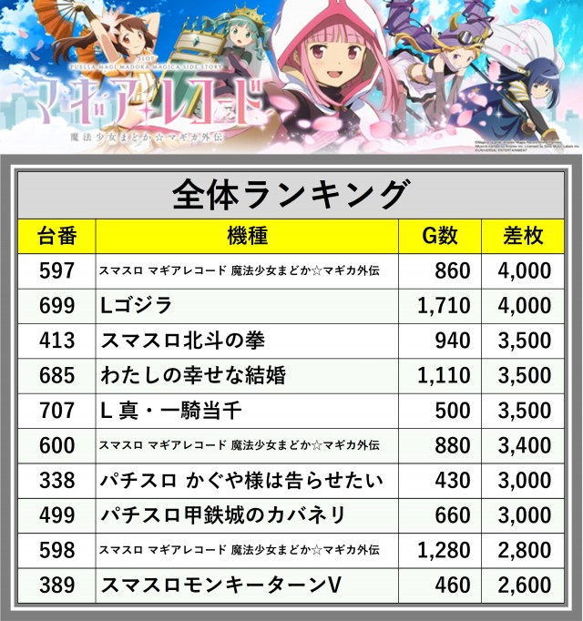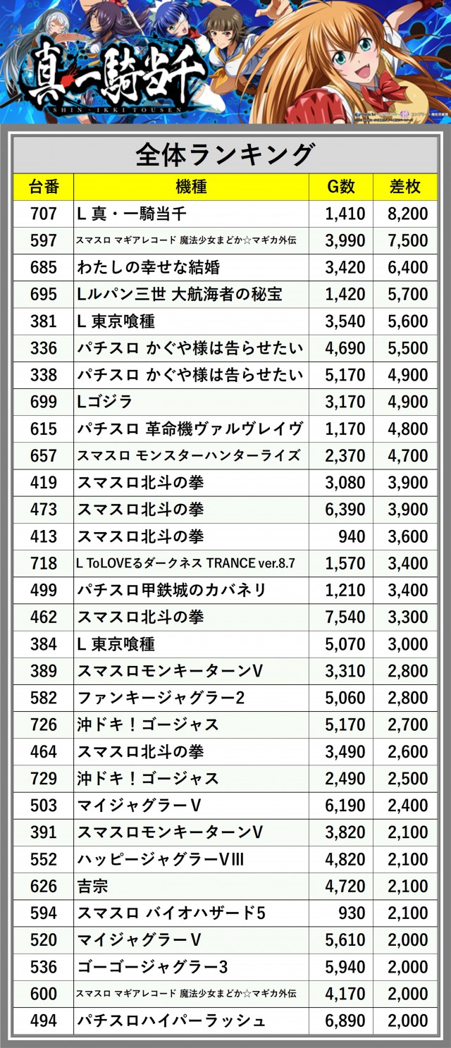 厳選された取材対象機種をはじめ、その他スロット全体から好記録が飛び出した!プレイヤーが楽しんだ1日を下記データにて振り返ってみて欲しい。