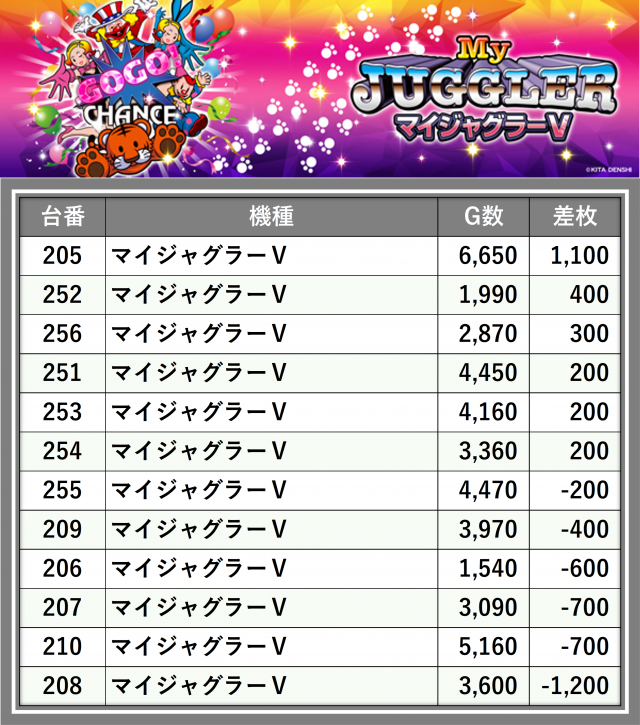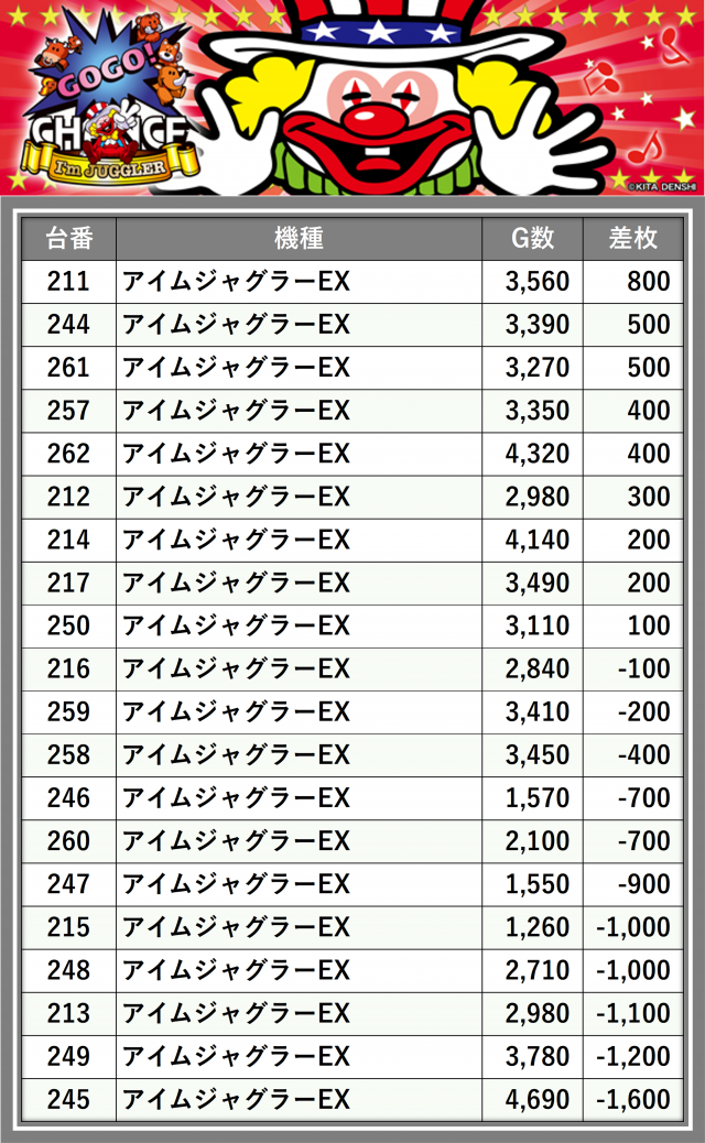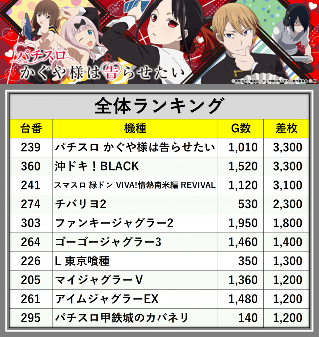 ※差枚数順に掲載しています