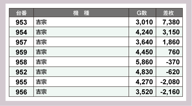 中でも大量獲得が魅力の『吉宗』では、953番台の+7,000枚オーバーを筆頭に全8台中4台がプラス差枚という結果を残し、多くのプレイヤーから注目を集めていた。