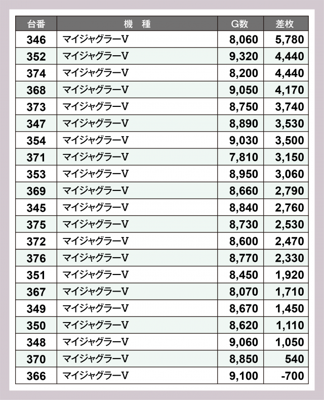 まず注目は『マイジャグラーⅤ』。設置21台の内20台が勝利を収め、346番台が+5,800枚弱となったのを筆頭に、+4,000枚オーバーが3台・+3,000枚&+2,000枚オーバーが5台ずつと、ボーナスタイプながらスマスロに負けない好況を迎えていた。