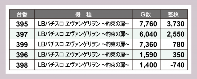 さらに『LBパチスロ ヱヴァンゲリヲン ~約束の扉~』もプラス率が高かったことを加えておきたい。
