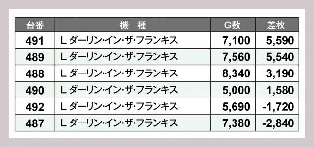その他では、『パチスロ からくりサーカス』に+7,600枚弱・+5,400枚弱が1台ずつ、『いざ!番長』に+6,200枚弱・+5,300枚超が1台ずつ、『L ダーリン・イン・ザ・フランキス』に+5,500枚超が2台と、現役最前線のスマスロが実力を発揮。