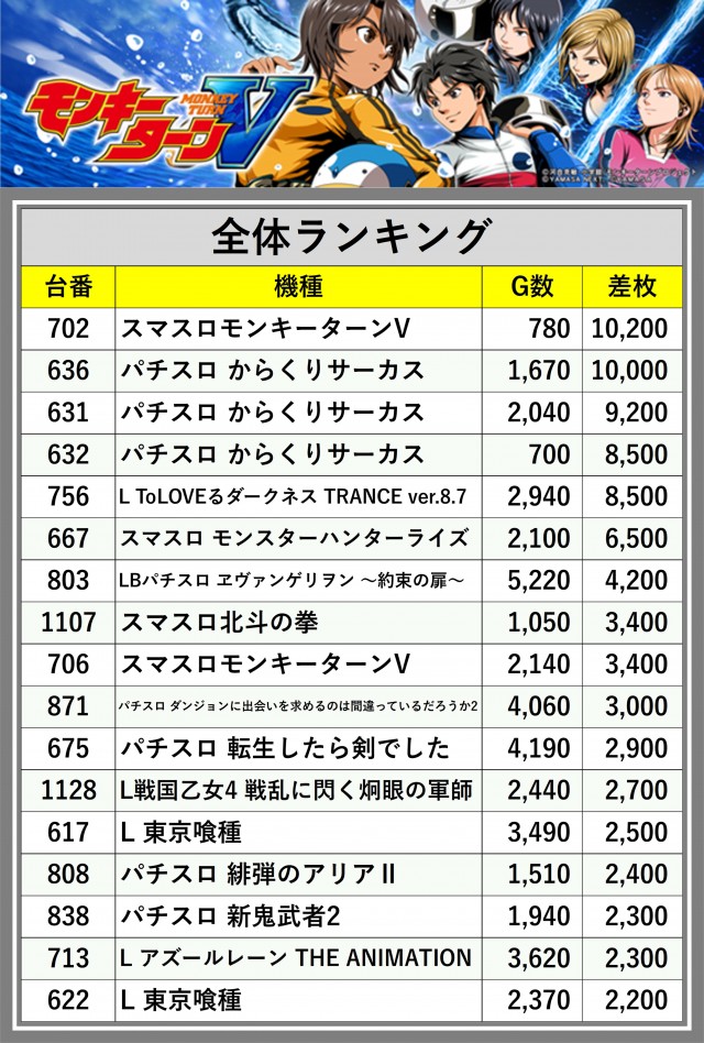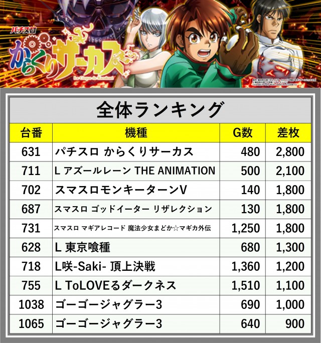 厳選された取材対象機種をはじめ、その他スロット全体から好記録が飛び出した!プレイヤーが楽しんだ1日を下記データにて振り返ってみて欲しい。