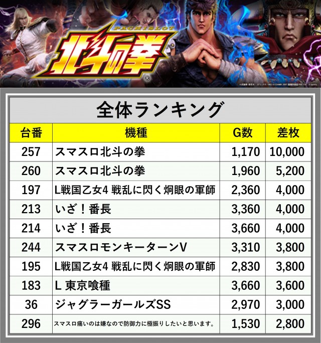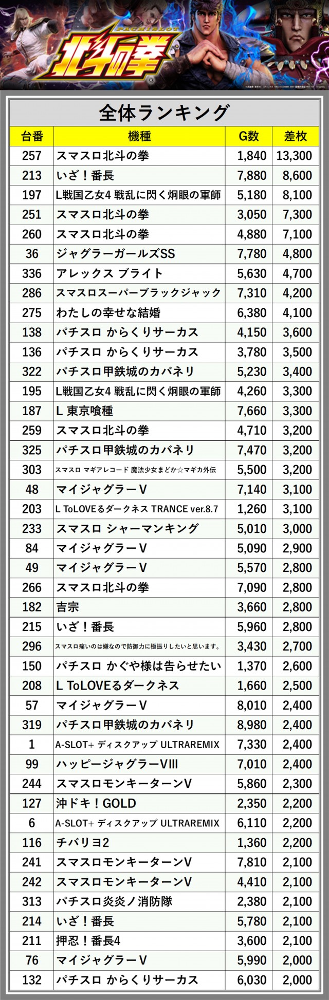 厳選された取材対象機種をはじめ、その他スロット全体から好記録が飛び出した!プレイヤーが楽しんだ1日を下記データにて振り返ってみて欲しい。