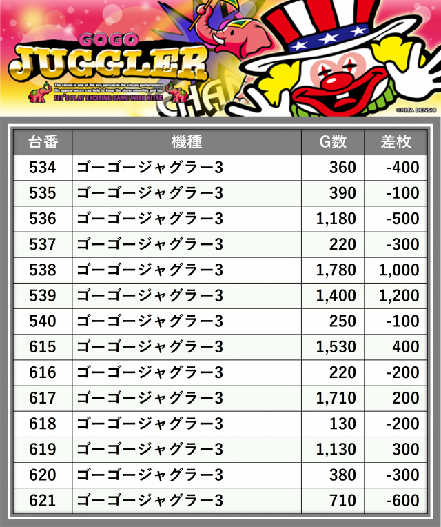 厳選された取材対象機種をはじめ、その他スロット全体から好記録が飛び出した!プレイヤーが楽しんだ1日を下記データにて振り返ってみて欲しい。