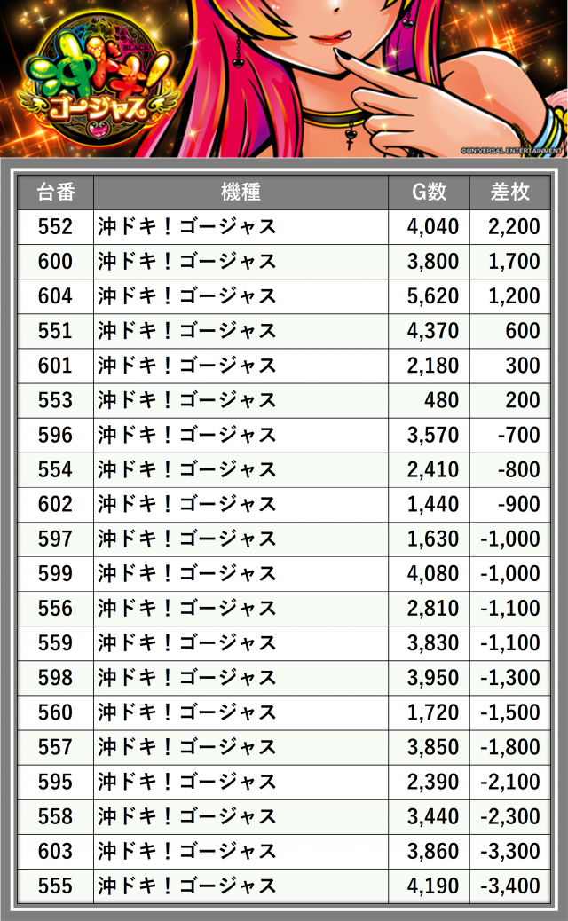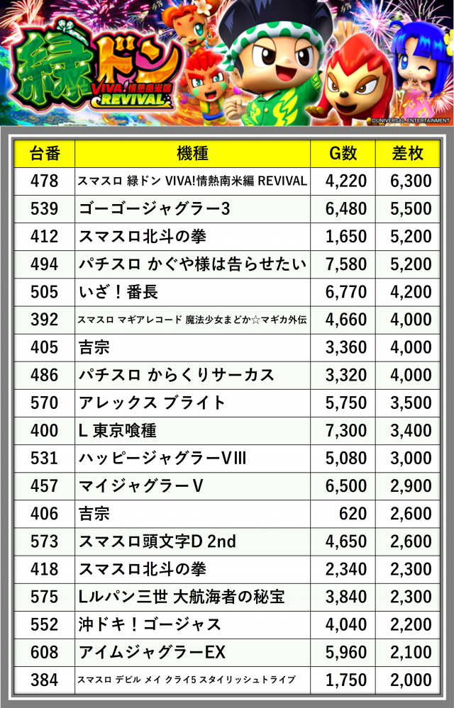 ※差枚数順に掲載しています