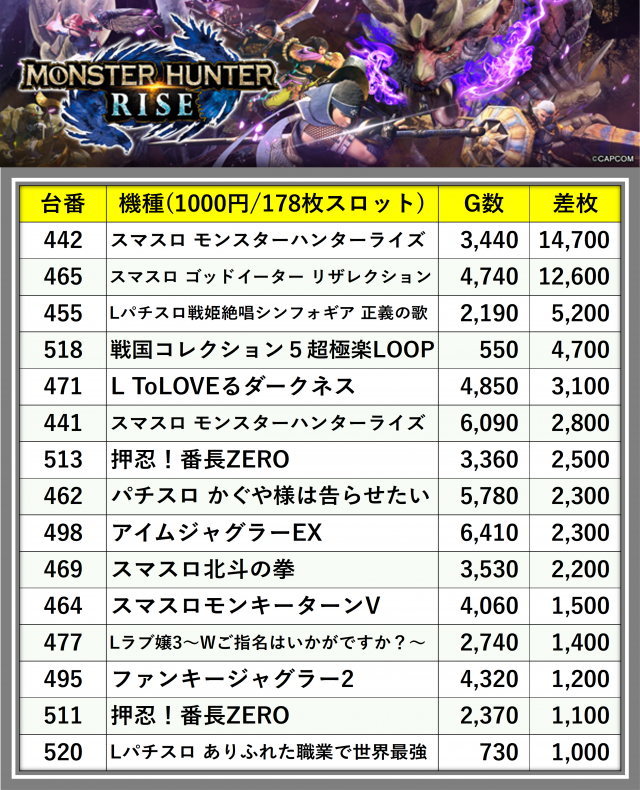 厳選された取材対象機種をはじめ、その他スロット全体から好記録が飛び出した!プレイヤーが楽しんだ1日を下記データにて振り返ってみて欲しい。