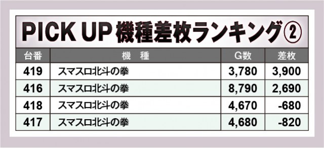 『押忍!番長4』や『L 東京喰種』、『スマスロモンキーターンV』から大台突破を確認でき、その大きな熱気の噴出はファンを笑顔にしていた。また『スマスロ北斗の拳』はもちろん、『アレックス ブライト』などノーマル機群も終日を通して打ち込まれた形跡が見られ、大きな手応えを感じていたのは間違いない。まとまった出玉を確保でき、ファンは有意義な時間を過ごしていたことだろう。