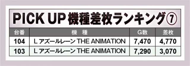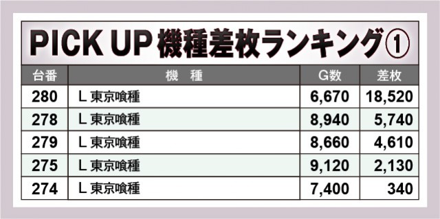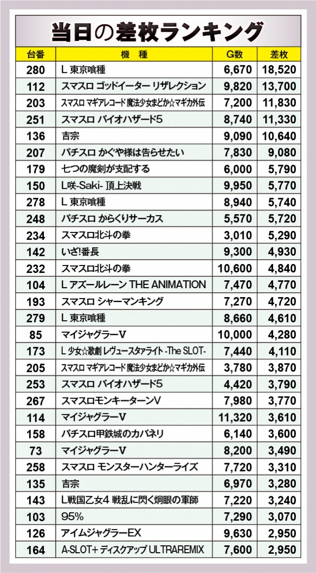 『L 東京喰種』にて18,520枚と凄まじい熱気が放たれており、さらに『スマスロ ゴッドイーター リザレクション』『スマスロ マギアレコード 魔法少女まどか☆マギカ外伝』『スマスロ バイオハザード5』『吉宗』でも万枚達成台を確認できる。上表を見れば全体的にまとまった出玉を確保していたのが鮮烈であるばかり。また万回転達成台も見られ、相当な手応えを感じられたのは間違いない。