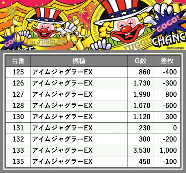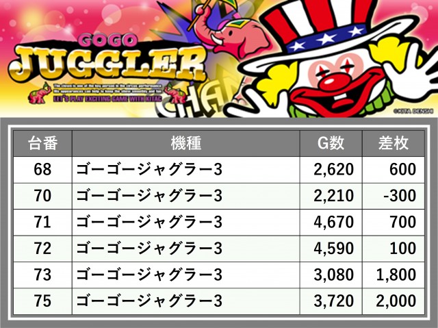 厳選された取材対象機種をはじめ、その他スロット全体から好記録が飛び出した!プレイヤーが楽しんだ1日を下記データにて振り返ってみて欲しい。