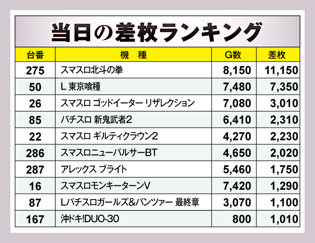 ※差枚数順に掲載しています。