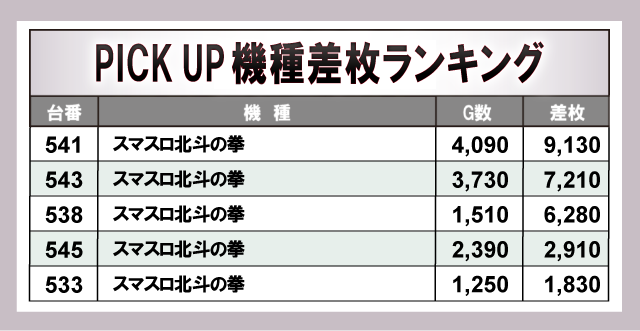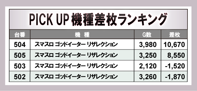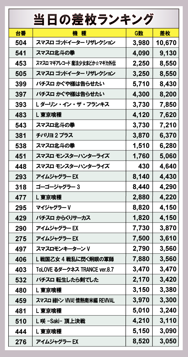 TOPは驚異の万枚OVERが発生し、『スマスロ ゴッドイーター リザレクション』で+10,760枚!そして、惜しくも万枚には届かなかったが、次点で『スマスロ北斗の拳』が+9,130枚!さらに『スマスロ マギアレコード 魔法少女まどか☆マギカ外伝』から+8,550枚!その他にも様々な機種がまとまった出玉を獲得しているほか、ランキングに掲載されている30台は全て3,000枚OVERとなっており、店内全体が凄まじい熱気に包まれていたことが窺える内容だ!
