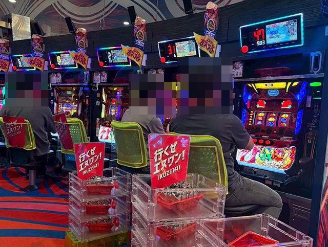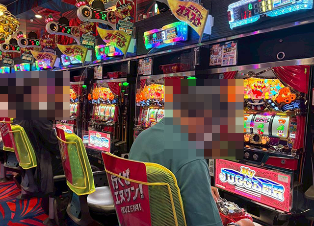 「マイジャグラーⅤ」も満席に近く、取材時に1箱以上の持ち玉を確認している。