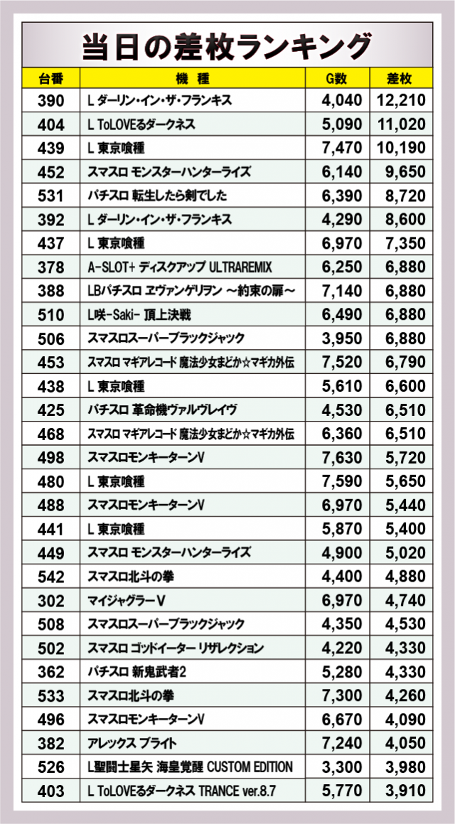 『L ダーリン・イン・ザ・フランキス』『L ToLOVEるダークネス』『L 東京喰種』で万枚OVERを達成し、当日の館内の盛り上がりを牽引。その後ろには『スマスロ モンスターハンターライズ』が9,000枚OVERで続いており、さらに新台『パチスロ 転生したら剣でした』『L咲-Saki- 頂上決戦』もしっかり好成績をマーク!また何よりも、上表はほぼ4,000枚OVERから名を連ねている点も見逃せず、各所から熱気が放たれていたと言えるだろう。