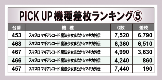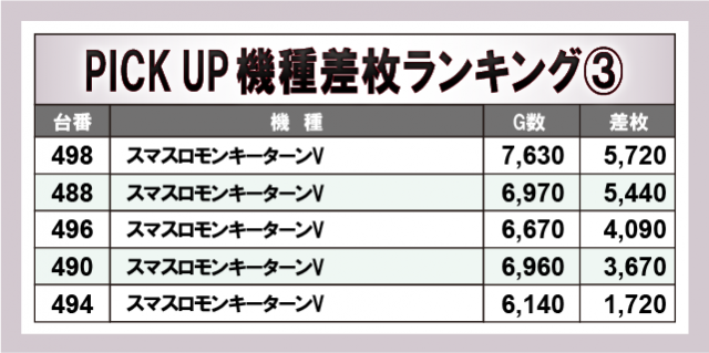 上表の5機種は『L 東京喰種』を筆頭に各所でまとまりのある出玉を確保する台が多数存在しており、大きな存在感を放っていた!またスマスロ機の活躍が目立つ一方で『マイジャグラーⅤ』もコンスタントに大当りを射止め、GOGOランプの輝きが遊技するファンの癒しとなっていた。
