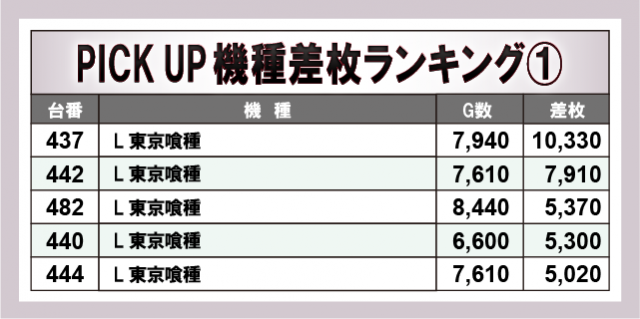 『L 東京喰種』にて万枚OVERが飛び出し、さらにその下にも複数台ランクインする盛況ぶりを披露していた!ほかにもスマスロ機を中心に随所で見どころのある展開が繰り広げられていたが、同時に『ジャグラー』シリーズや『パチスロこの素晴らしい世界に祝福を!』といったメダル機も名を連ね、その存在感をアピールしていたのが鮮烈だ。