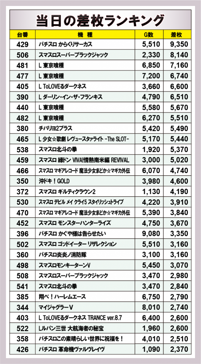 ※差枚数順に掲載しています。