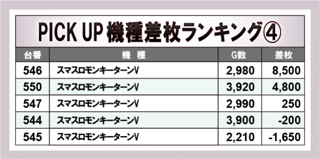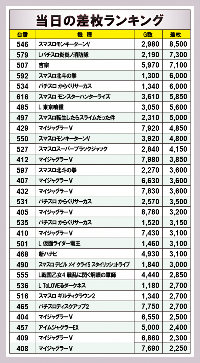上表は2,000枚OVERから名を連ねており、館内は大きな熱気に包まれていたのが手に取るように分かる。そのなかで『スマスロモンキーターンV』や『Lパチスロ炎炎ノ消防隊』などスマスロ人気機種たちが軒並み上位をマークしているが、『マイジャグラーⅤ』も+4,850枚とあと少しで大台突破というところまで食らいついていた!またその下をみても同機種が複数台ランクインしており、安定した結果で大いに盛り上がりを見せていたようだ!