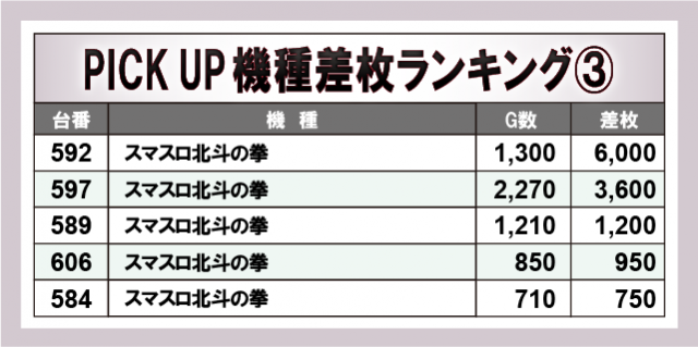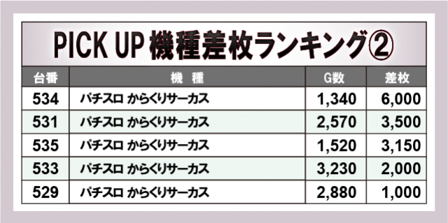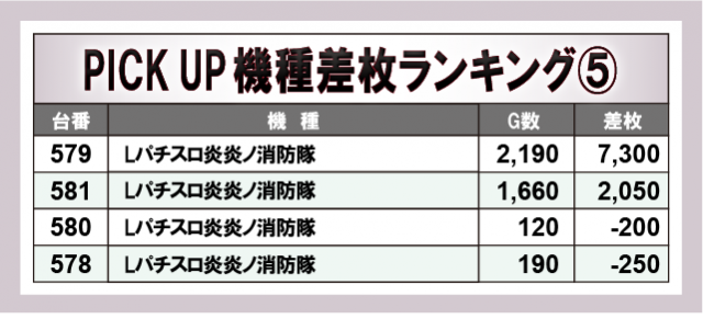 上表の5機種はいずれも安定感のあるパフォーマンスを披露していたことが窺える。突出していたのが『マイジャグラーⅤ』で4,000枚OVERを筆頭に4桁プラス台が多数発生しており、また回転数も6~8,000回転OVERをマークし打ちごたえのある状況が整っていた!スマスロ機からは『パチスロ からくりサーカス』『スマスロ北斗の拳』『スマスロモンキーターンV』『Lパチスロ炎炎ノ消防隊』といった定番機種から好調台がうまれ、各機種に満遍なくチャンスがあったことが窺える内容となった!