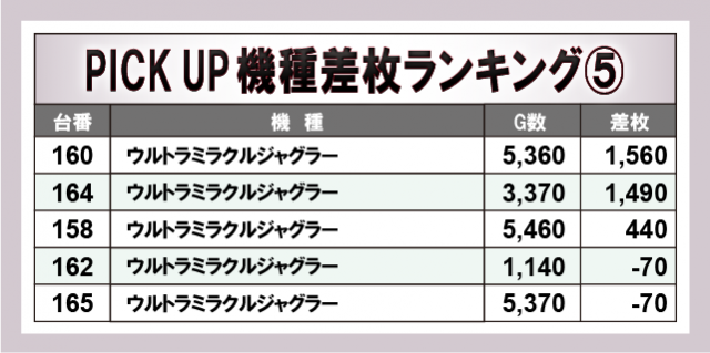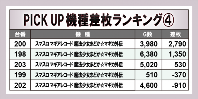 続いて優秀機種に目を向けると、前述した『マイジャグラーⅤ』『スマスロモンキーターンV』のほかにも、『パチスロ からくりサーカス』『スマスロ マギアレコード 魔法少女まどか☆マギカ外伝』『ウルトラミラクルジャグラー』から複数のプラス差枚数を築いた台が目立っている。可能性を秘めていた台と言い換えることでき、いち早くそのことに気付いたファンは、有意義な時間を過ごしていたはずだ。