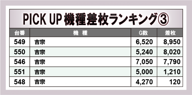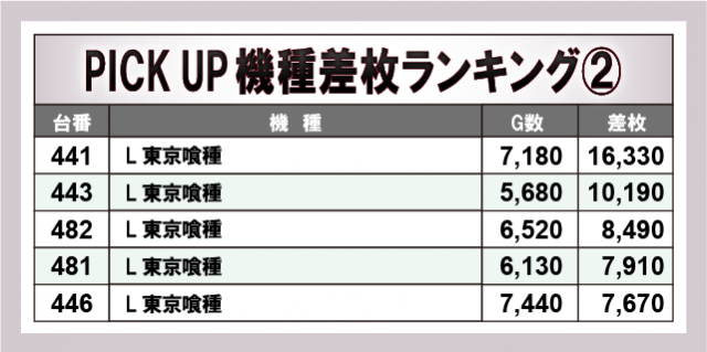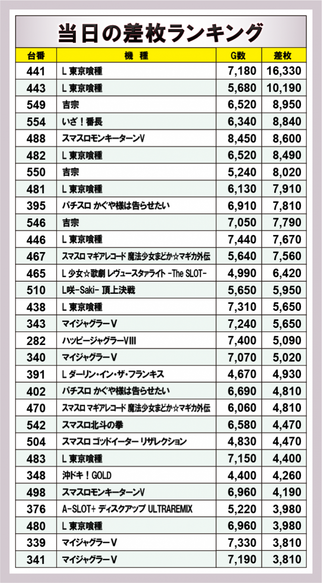 2台の万枚OVERがうまれた『L 東京喰種』がワンツーフィニッシュ!さらに『吉宗』『いざ!番長』『スマスロモンキーターンV』『L 東京喰種』にて8,000枚OVERをマーク。また『マイジャグラーⅤ』『ハッピージャグラーVⅢ』といったノーマルタイプから5,000枚OVERがうまれている点も見逃せず、館内の大きな熱量が窺えるばかりだ。そして複数の台で終日を通して打ち込まれており、いかに手応えを感じられる状況だったのかも見て取れる。