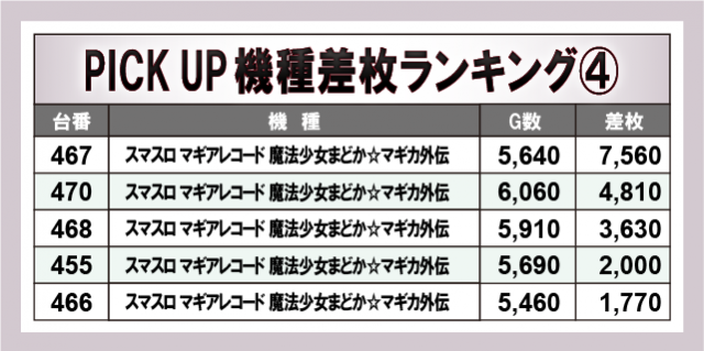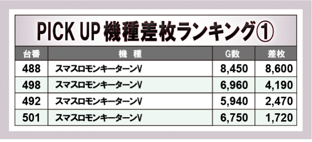 『スマスロモンキーターンV』『L 東京喰種』『吉宗』『スマスロ マギアレコード 魔法少女まどか☆マギカ外伝』といったスマスロ人気機種を筆頭に圧巻のパフォーマンスを披露していた。『マイジャグラーⅤ』もその勢いに追随しており、各所で大台突破台が発生し活気に満ちた状況で、これら優秀機種の高いパフォーマンスが上表から窺えるばかりだ。