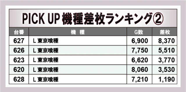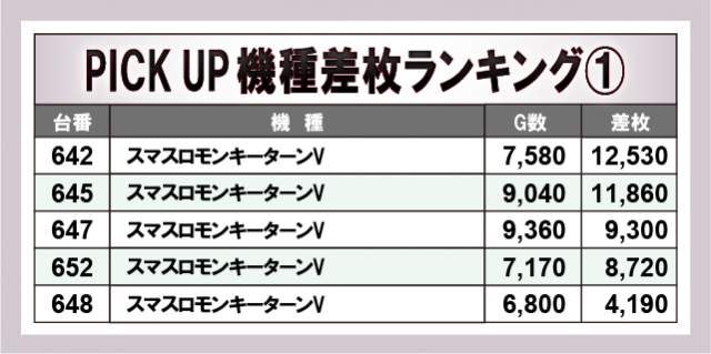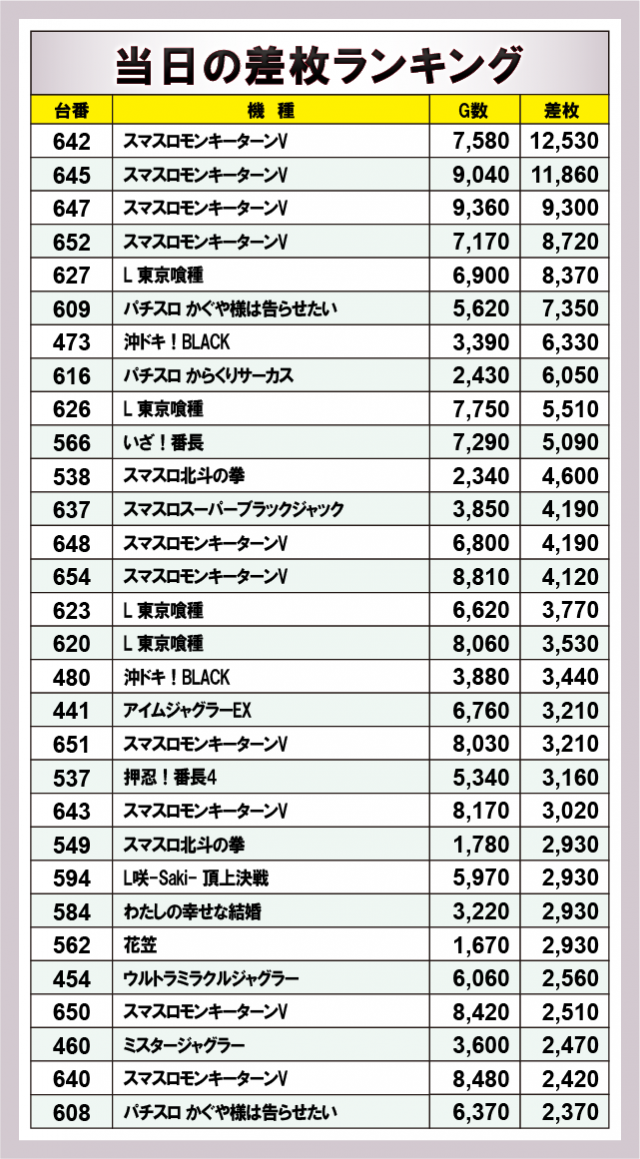 なんと『スマスロモンキーターンV』4台が上位を独占!ほかにも複数台がランクインし、当日の店内の盛り上がりを大きくリードしていた!その甲斐もあって様々な機種からまとまった出玉を確保する台が多く見られ、ファンはレバーオンが楽しくなっていたことだろう。また朝から閉店までじっくりと打ち込まれた形跡は、彼らがいかに好感触を得ていたのかが窺えるばかりだ。