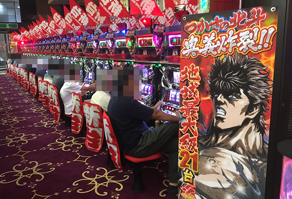新台の「パチスロ北斗の拳 新伝説創造」も注目を受けており、シマ内は楽しげな雰囲気。
