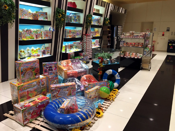 景品コーナーには、食料品や生活雑貨から子どものおもちゃまで幅広い取り揃え。ビーチボールや浮き輪など季節の商品も充実している。