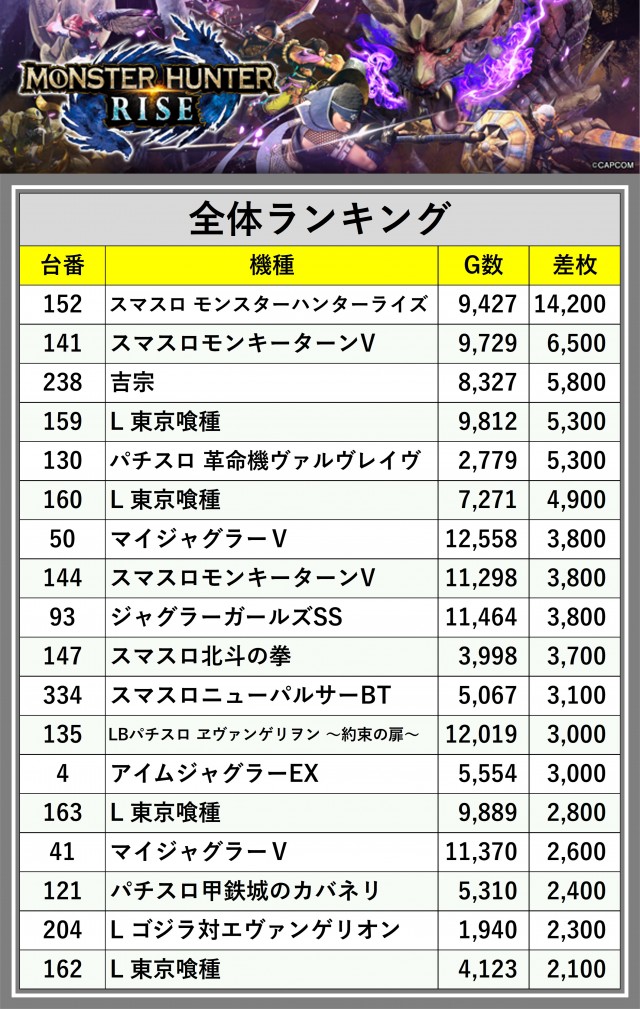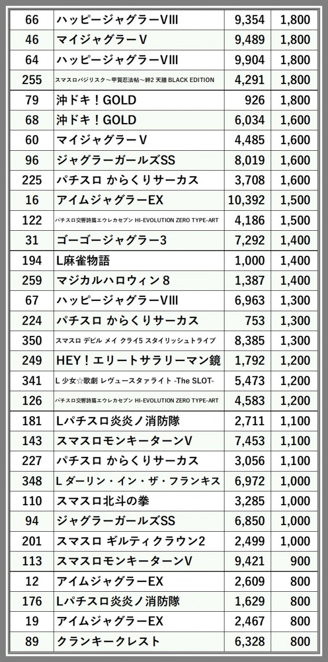 ※差枚数順に掲載しています