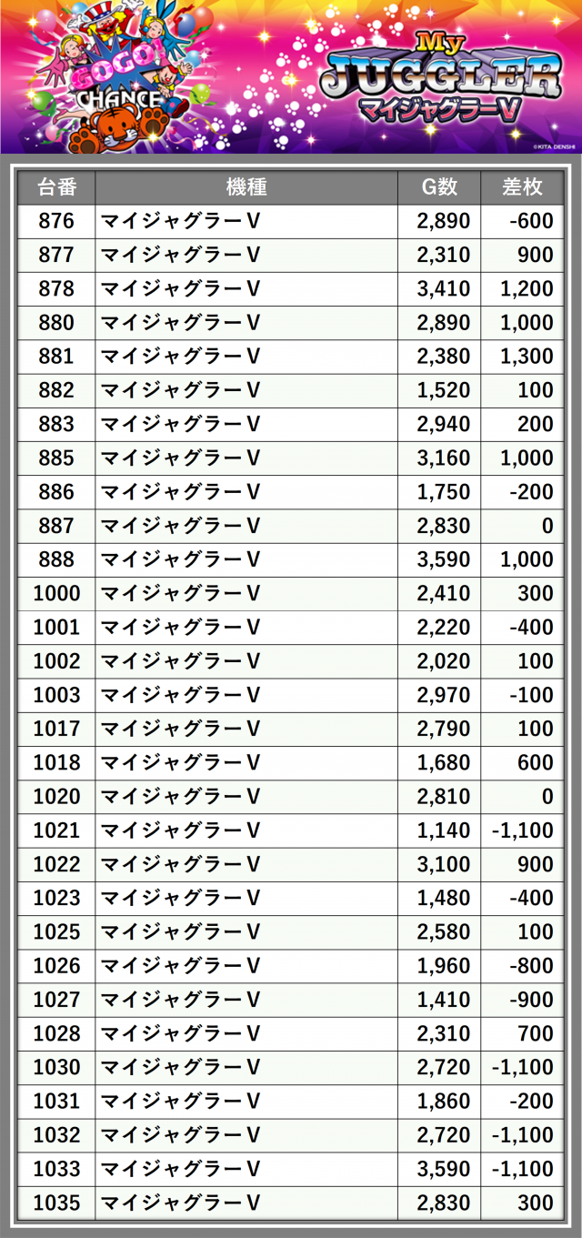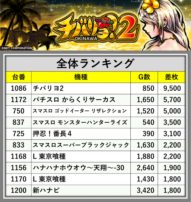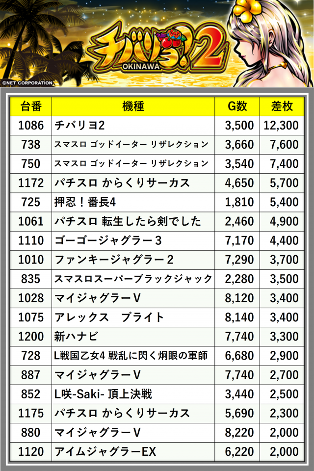 厳選された取材対象機種をはじめ、その他スロット全体から好記録が飛び出した!プレイヤーが楽しんだ1日を下記データにて振り返ってみて欲しい。