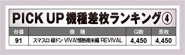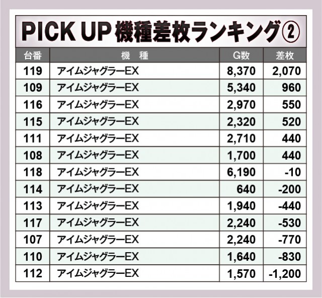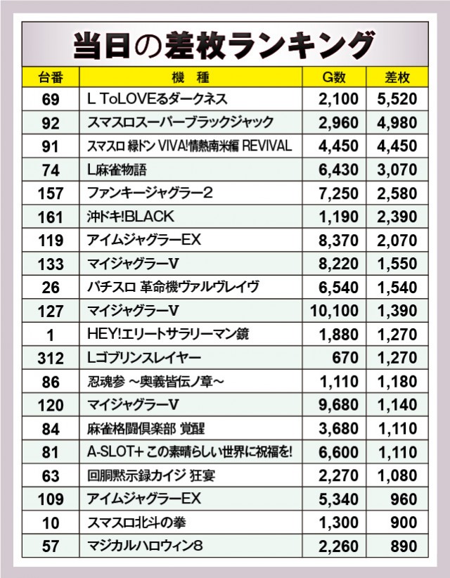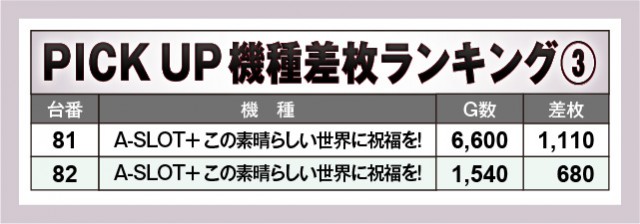 老若男女問わず愛される『アイムジャグラーEX』は高い活気が特徴的で、その半分がプラス差枚数を達成。『A-SLOT+ この素晴らしい世界に祝福を!』も全台プラス差枚数となっており、『スマスロスーパーブラックジャック』『スマスロ 緑ドン VIVA!情熱南米編 REVIVAL』も大きな熱を披露していた。上表の機種がポテンシャルを秘めていたのは確かで、遊技していたファンは力強くレバーを叩けたはずだ。