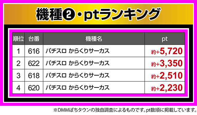 『パチスロ からくりサーカス』の616番台も約+5,700ptを上回った。