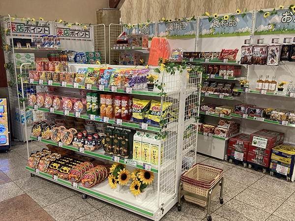 景品コーナーにはお菓子・インスタント食品・酒類など多彩なアイテムが揃っており、プレイヤーたちの目を引いていた。