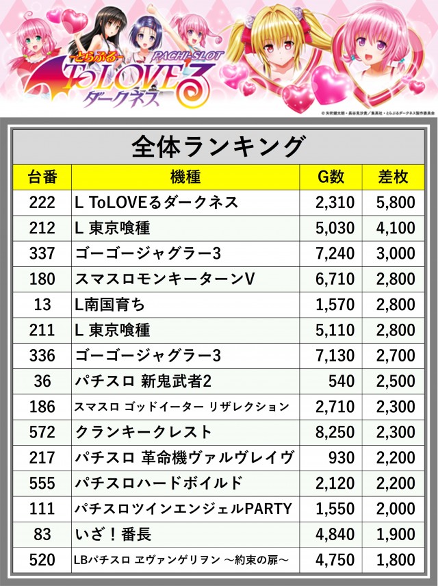 厳選された取材対象機種をはじめ、その他スロット全体から好記録が飛び出した!プレイヤーが楽しんだ1日を下記データにて振り返ってみて欲しい。