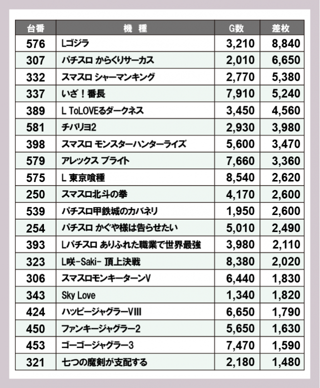 機種別差枚ランキング