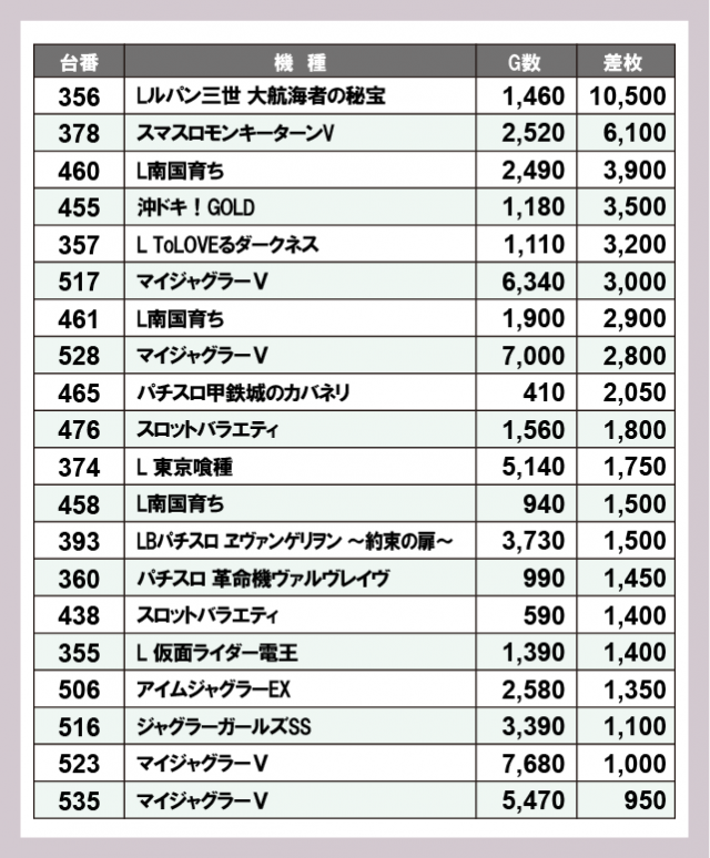 ※差枚数順に掲載しています