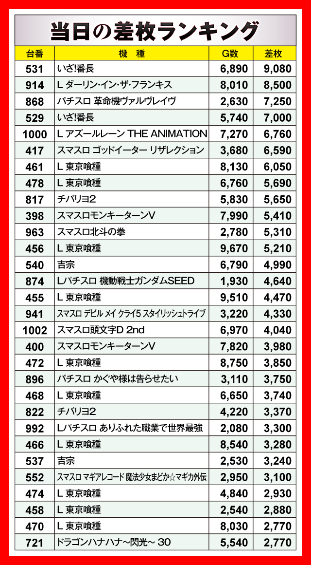 トップの座についたのは『いざ!番長』。531番台+9,080枚と、惜しくも万枚ならずの好成績をおさめた。次いで『L ダーリン・イン・ザ・フランキス』914番台+8,500枚で、大満足の結果に。そして『パチスロ 革命機ヴァルヴレイヴ』868番台+7,250枚、『いざ!番長』529番台+7,000枚などなど、非常にハイレベルな差枚が並んでいる。