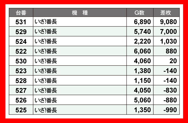 『いざ!番長』は10台中5台がプラス差枚。ランキングで上位だった531番台と529番台が牽引して、トータル差枚でも大きくプラスとなっている。
