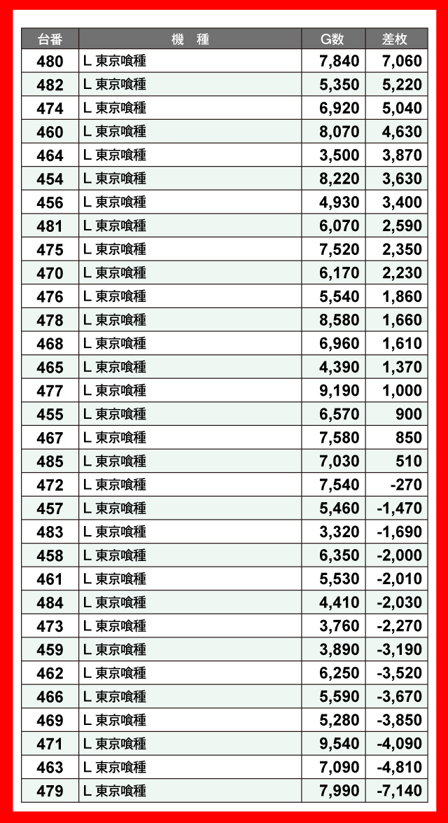 同店最大設置台数の『L 東京喰種』からは大幅プラス差枚の台が多数誕生。人気ぶりと実力を示していた。