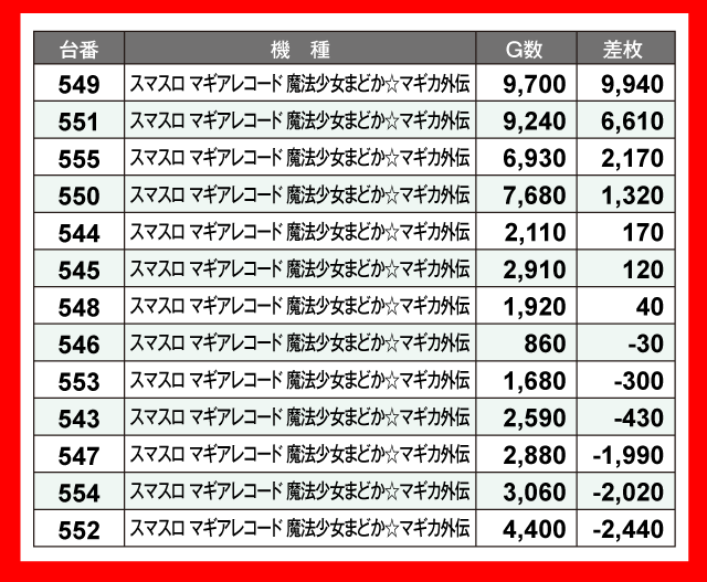 最も輝いたのは長期稼働中の2機種。『パチスロ からくりサーカス』858番台が+15,450枚、『スマスロ北斗の拳』968番台が+10,260枚と、2台が1万枚オーバーを達成している。そして『スマスロ マギアレコード 魔法少女まどか☆マギカ外伝』549番台が+9,940枚、『いざ!番長』522番台が+9,460枚、『わたしの幸せな結婚』986番台が+9,130枚とつづく。さらに『L 東京喰種』480番台の+7,060枚など、誰もがうらやむような優秀台がズラリと並んでいた。